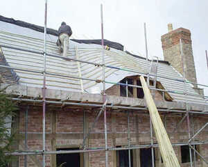 Starting at the eaves Thatch Firewall Membrane is laid horizontally across roof timbers that are normally set at approximately 400mm centres, with a minimum 75mm overlap required on all joints. The Thatch Firewall Membrane can either be stapled or nailed to the rafters and then battens are fitted over the top with 300mm centres, with the first batten 125mm from the arris rail.